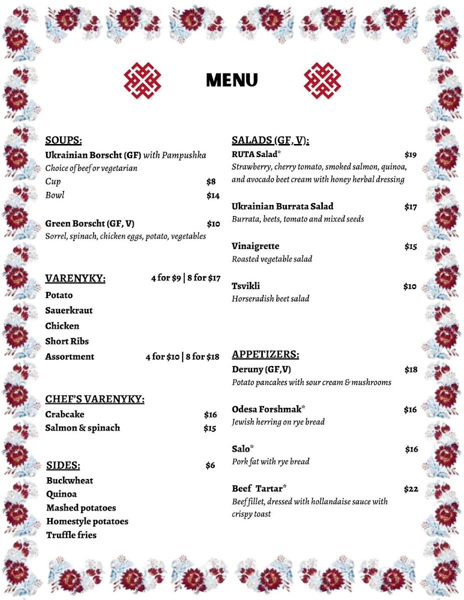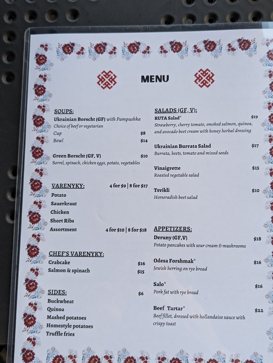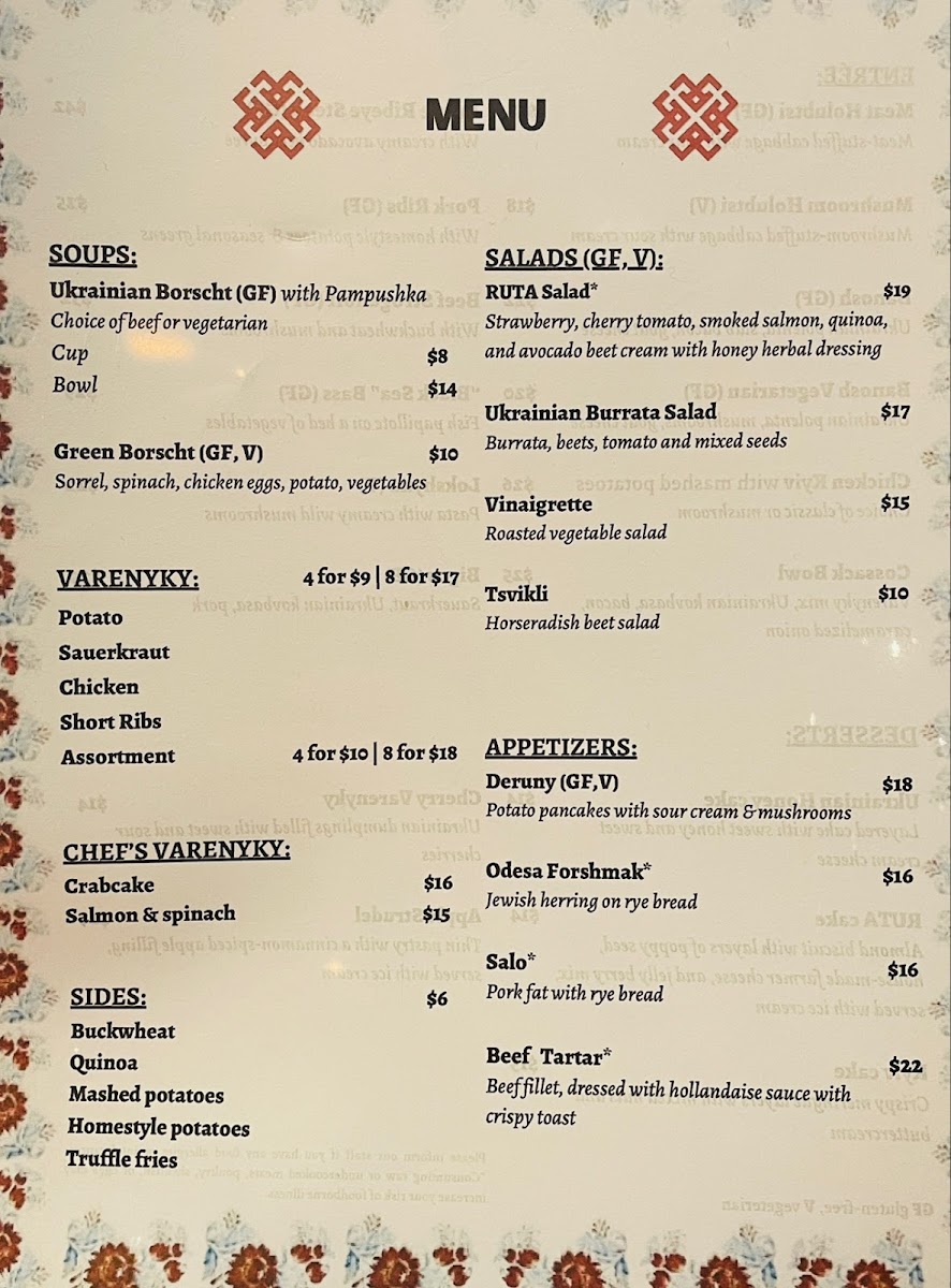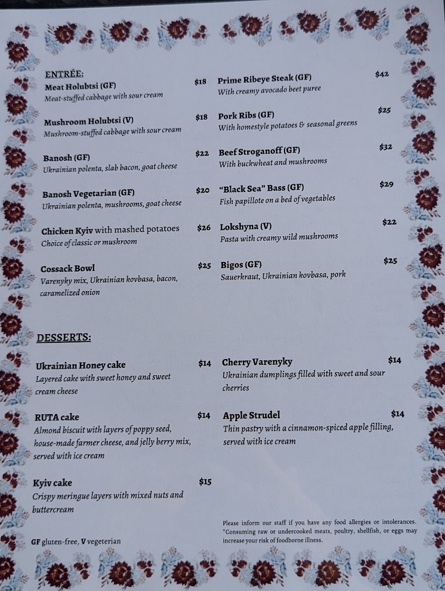 6 varenykiv (3 popato & 3 beef) , Ukrainian kovbasa, bacon, caramelized onion